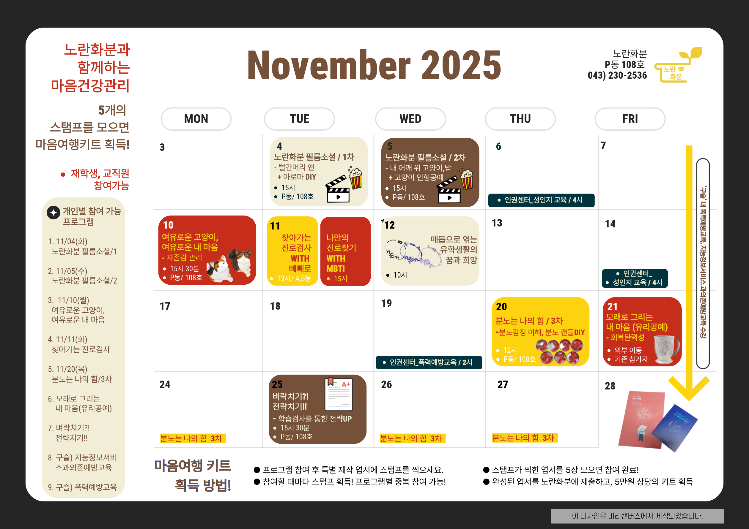 5개의 스탬프를 모으면 마음여행 키트 획득!! ▶ 어떻게 참여하나요? 노란 화분에서 진행하는 2학기 프로그램에 참여하면 특별 제작한 엽서에 스탬프를 찍어드립니다. 한번 참여할 때마다 스탬프가 찍힌 엽서를 계속해서 획득! 스탬프가 찍힌 엽서 5장을 모아요. 5장의 스탬프 찍힌 엽서를 노란 화분에 제출하고, 5만원 상당의 특별한 다이어리를 선물로 받으세요. 11월에 참여할 수 있는 프로그램들을 소개합니다. 1. 노란 화분 필름 소셜: 빨간 머리 앤 일시 - 25년 11월 4일 (화) 오후 3시 P동 문예관 108호 노란 화분 내용 - 이번 모임에서는 ‘빨간 머리 앤’을 감상합니다. 맛있는 피자를 즐기며 친구 집에서 영화를 보듯 편안하고 자유로운 분위기에서 진행됩니다. 영화 관람 후, 천연 아로마 스프레이 만들기 활동이 이어집니다. 참여링크: https://forms.gle/ZQC1vsbWt9BiJdms8 2. 노란 화분 필름 소셜: 내 어깨 위 고양이, 밥 일시 - 25년 11월 5일 (수) 오후 3시 P동 문예관 108호 노란 화분 내용 - 이번 모임에서는 ‘내 어깨 위 고양이, 밥’을 감상합니다. 맛있는 피자를 즐기며 친구 집에서 영화를 보듯 편안하고 자유로운 분위기에서 진행됩니다. 영화 관람 후, 나만의 고양이 피큐어 만들기 활동이 이어집니다. 참여링크: https://forms.gle/ZQC1vsbWt9BiJdms8 3. 노란 화분 자존감 싹 틔우기 (공예활동 지원: 노리개 만들기) 일시 - 25년 11월 10일 (월) 오후 3:30 ~ 5:00 P동 문예관 108호 노란 화분 내용 - 자존심과 자존감의 차이! 자존감 이해를 위한 짧은 강의 후, 나만의 고양이 피규어 만들기 활동이 이어집니다. 참여링크: https://forms.gle/yhTaZ7Xo7Gn2TX4CA 4. 노란 화분 찾아가는 진로검사 일시 - 25년 11월 11일 (화) 오후 1:00 ~ 2:00 A동 앞 벤치 내용 - 나의 진로에 대한 고민을 나눠보아요. 현장에서 간단한 진로 검사 후, 빼빼로 데이 선물 받아가세요. 5. 분노는 나의 힘 – 분노를 긍정 자원으로 변화시키는 특별한 일기 (공예활동 지원: 분노 캔들 만들기) 일시 - 25년 11월 20일 (목) 오후 12:00 ~ 2:00 P동 문예관 108호 노란 화분 내용 - 매일 감정을 기록하고, 분노를 유발한 상황과 그에 대한 반응을 일기에 정리해요. 해당일에 점심식사 제공합니다. 참여링크: https://forms.gle/imsp8mN53f29fiAY9 6. 노란 화분 회복탄력성 싹 틔우기 (공예활동 지원:유리 공예) 일시 - 25년 11월 21일 (금) 오후 2:30 ~ 6:00 P동 문예관 108호 노란 화분 내용 - 맛있는 커피와 디저트를 먹으며, 회복탄력성에 관한 이야기를 나눠요. 그리고 오송에 위치한 ‘유리마루공방’에서 유리컵 공예를 합니다. 유리컵 샌딩 작업 후, 바로 수령해 가실 수 있습니다. 참여대상: 11월 노란화분 프로그램 2회 이상 참여한 재학생만 가능 참여링크: https://forms.gle/qsYoQJdAT1dwyaH27 7. 노란 화분 학습 전략 세우기 – MLST-Ⅱ 학습전략검사 일시 - 25년 11월 25일 (화) 오후 3:30 ~ 5:00 P동 문예관 108호 노란 화분 내용 - 자신의 학습 동기, 환경 관리 능력, 정보 처리 방식, 시험 준비 전략 등 공부 전반에 걸친 습관과 전략을 분석합니다. 참여링크: https://forms.gle/8K4yr4Zr8gm9cThK6 학생상담센터 노란화분 11월 프로그램 안내입니다. 더 궁금하신 사항이 있으시면 언제든지 노란화분으로 연락주세요. 043)230-2536 |