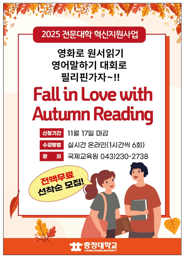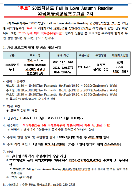 학생공지 학생공지 일반공지 장학/학자금 공지 감염병안내 공모/모집/시험 도서관 생활관 기부금공개 업무추진비공개 보육교원연수원 기타공고 충청대학교_대표-학생공지(대표_충청마당_공지사항_학생공지) 상세보기 - 제목, 내용, 파일, 작성자, 조회수, 작성일, 학과공지, 주소링크 정보 제공 2025학년도 "❤️Fall in Love Autumn Reading 외국어능력향상프로그램2차❤️" 안내 작성자 : 김아진 작성일 : 2025-11-13 조회 : 152 . 파일 jpg 문서 포스터.jpg hwp 문서 2025학년도 외국어능력향상프로그램 개설 안내문.hwp hwp 문서 2025학년도 외국어능력향상프로그램 참가신청서.hwp png 문서 12345.png 주소링크 목록 게시물삭제 광고 반복작성 욕설 본인삭제 게시물삭제 이전글 [교수학습지원실] 교과·비교과 과정설계 공모전 참가신청 안내 다음글 2025학년도 2학기 중간 강의평가(간호학과 블록수업) 설문 실시